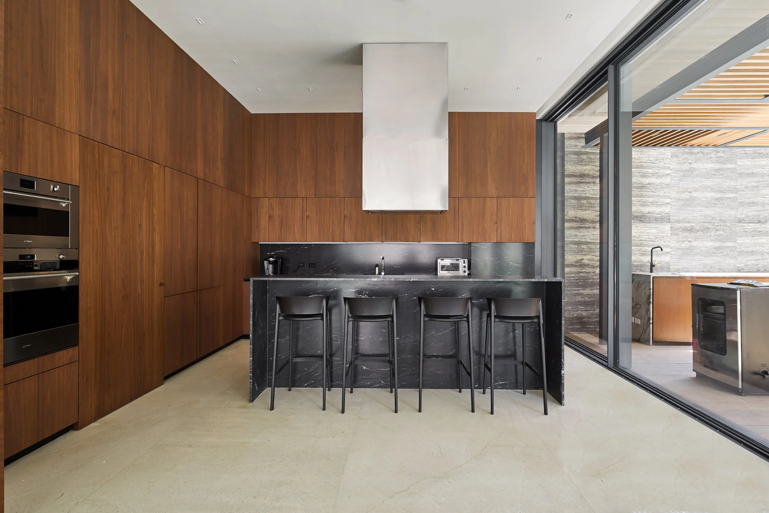 Este proyecto es una celebración del contraste escultural. La calidez envolvente de la madera natural define la verticalidad, mientras que la isla monolítica de piedra oscura ancla el espacio con una presencia dramática. Una arquitectura de cocina concebida no solo para cocinar, sino para habitarla, creando un diálogo fluido entre el lujo interior y la serenidad del exterior.